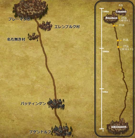 아─라고 님보다 지도의 계속을 받았습니다. 왕도가 가까워져 왔어요. 나머지 약 970킬로입니다.あーてぃ様より地図の続きを戴きました。王都が近づいてきましたね。残り約970キロです。